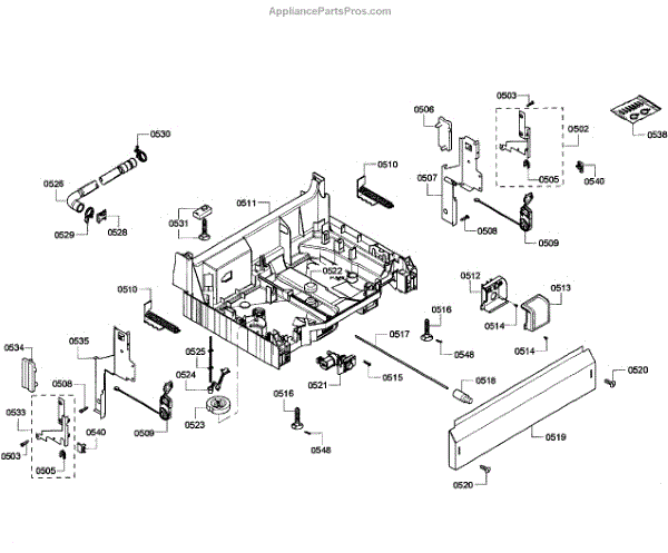 The Base Panel is an OEM part for Bosch dishwashers. It serves as a protective cover for the bottom of the dishwasher, shielding internal components from debris, moisture, and damage while also contributing to the appliance's structural stability.