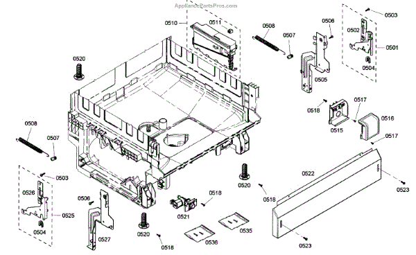 The Base Panel is an OEM part for Bosch dishwashers. It serves as a protective cover for the bottom of the dishwasher, shielding internal components from debris, moisture, and damage while also contributing to the appliance's structural stability.