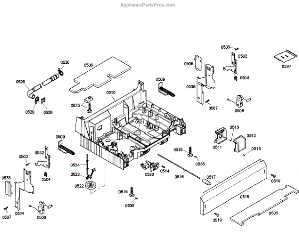 The Base Panel is an OEM part for Bosch dishwashers. It serves as a protective cover for the bottom of the dishwasher, shielding internal components from debris, moisture, and damage while also contributing to the appliance's structural stability.