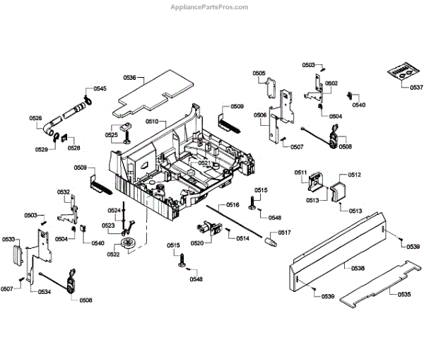 The Base Panel is an OEM part for Bosch dishwashers. It serves as a protective cover for the bottom of the dishwasher, shielding internal components from debris, moisture, and damage while also contributing to the appliance's structural stability.