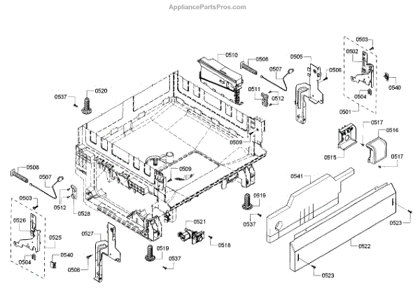 The Base Panel is an OEM part for Bosch dishwashers. It serves as a protective cover for the bottom of the dishwasher, shielding internal components from debris, moisture, and damage while also contributing to the appliance's structural stability.