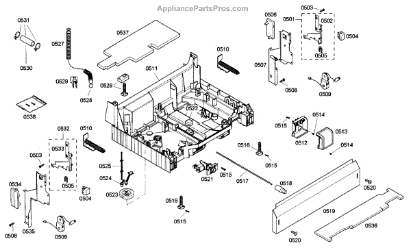 The Base Panel is an OEM part for Bosch dishwashers. It serves as a protective cover for the bottom of the dishwasher, shielding internal components from debris, moisture, and damage while also contributing to the appliance's structural stability.