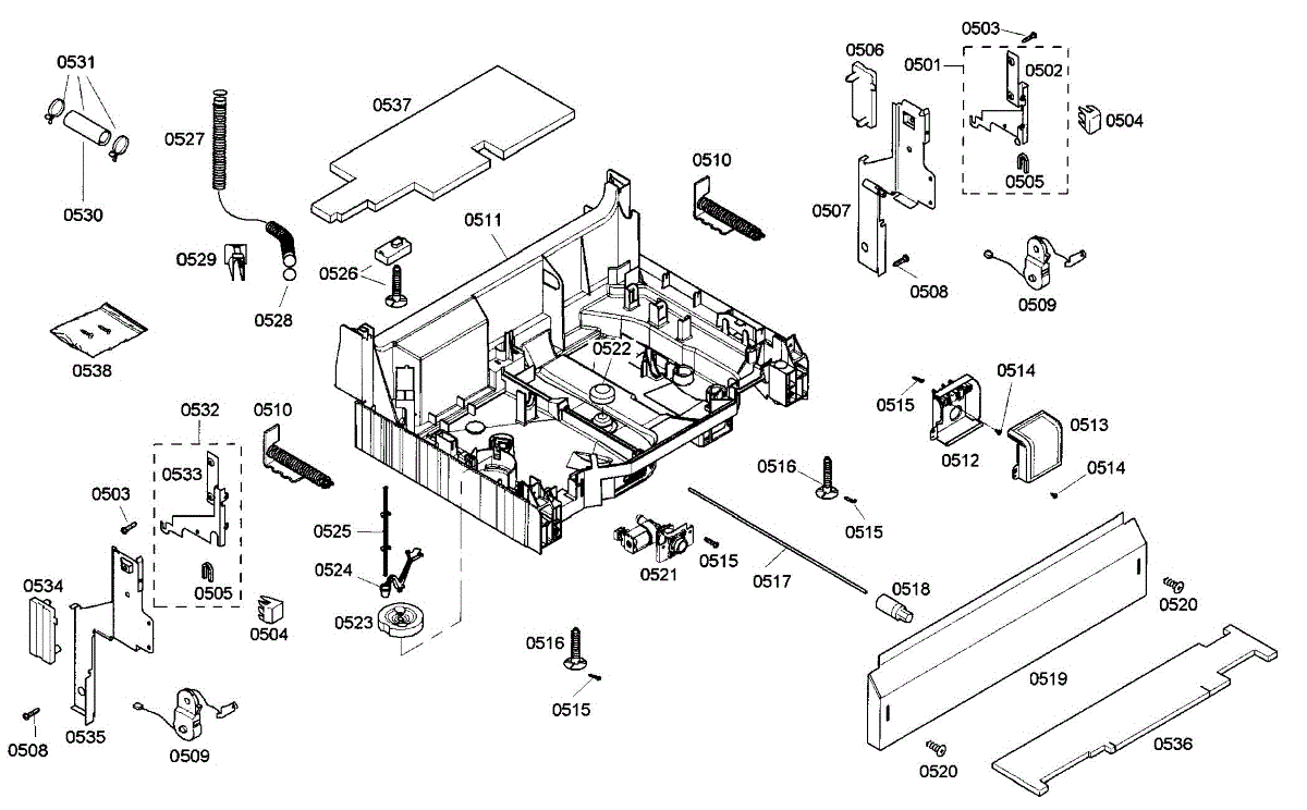 The Base Panel is an OEM part for Bosch dishwashers. It serves as a protective cover for the bottom of the dishwasher, shielding internal components from debris, moisture, and damage while also contributing to the appliance's structural stability.