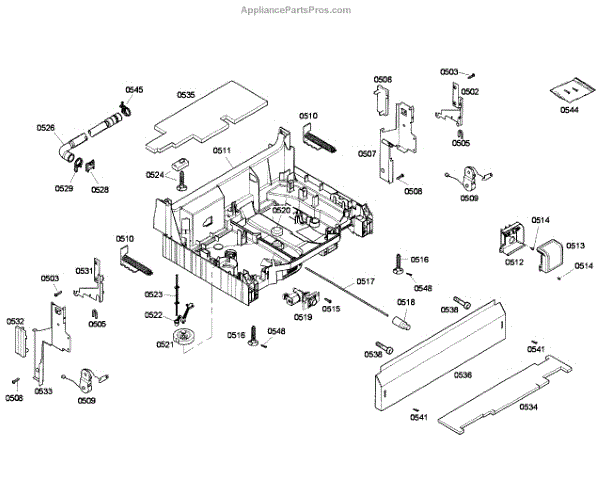The Base Panel is an OEM part for Bosch dishwashers. It serves as a protective cover for the bottom of the dishwasher, shielding internal components from debris, moisture, and damage while also contributing to the appliance's structural stability.