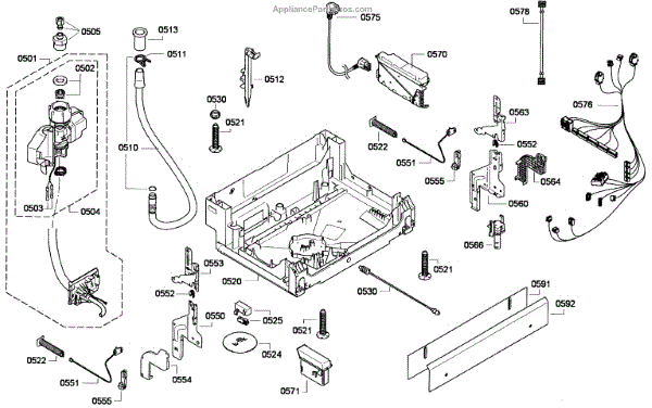 The Power Cord is an OEM replacement part for Bosch dishwashers. It supplies electrical current that allows the dishwasher to properly perform cycles. Located at the rear of the appliance, it plugs into a standard three-prong outlet. Causes for power cord replacement include cracking, splitting, or breaks in the protective insulation over time from repeated bending and stress. Symptoms of a faulty power cord include: