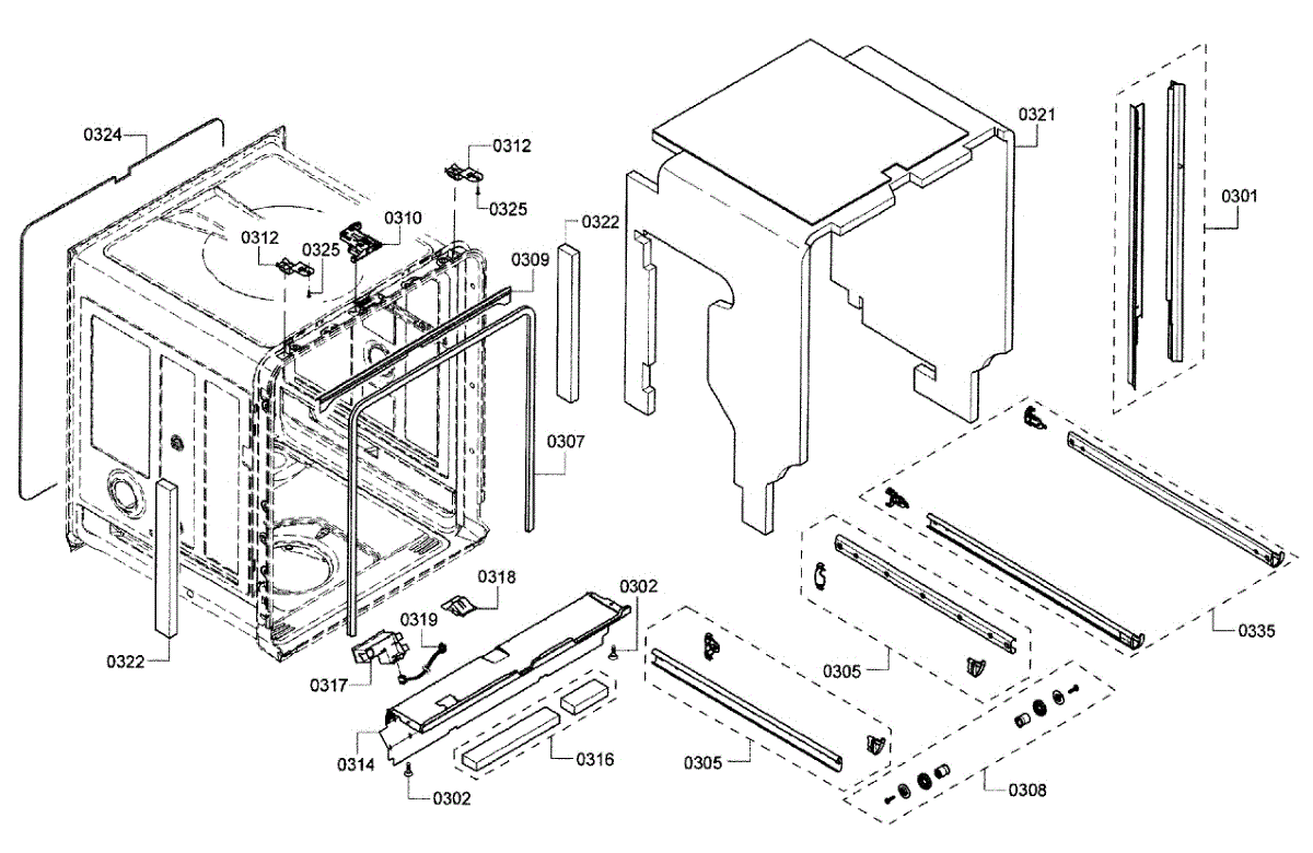 Main outer housing casing for dishwasher components. Secures internal parts and protects moving components. Replace if cracked, broken, or damaged.