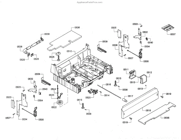 The Base Panel is an OEM part for Bosch dishwashers. It serves as a protective cover for the bottom of the dishwasher, shielding internal components from debris, moisture, and damage while also contributing to the appliance's structural stability.