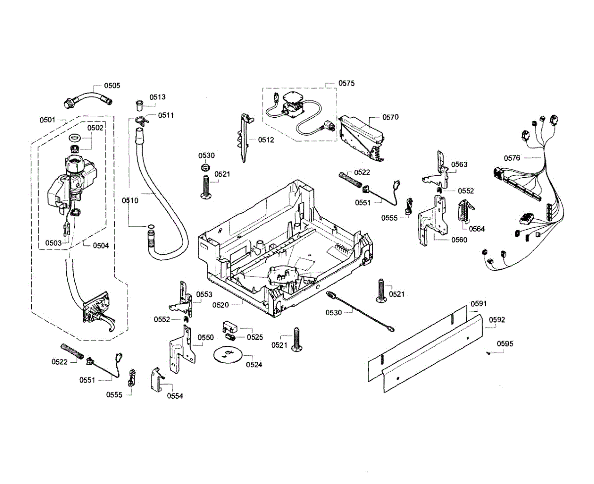Lower housing that protects and supports internal components at the dishwasher base. Replace if cracked, broken, or missing to restore enclosure integrity.