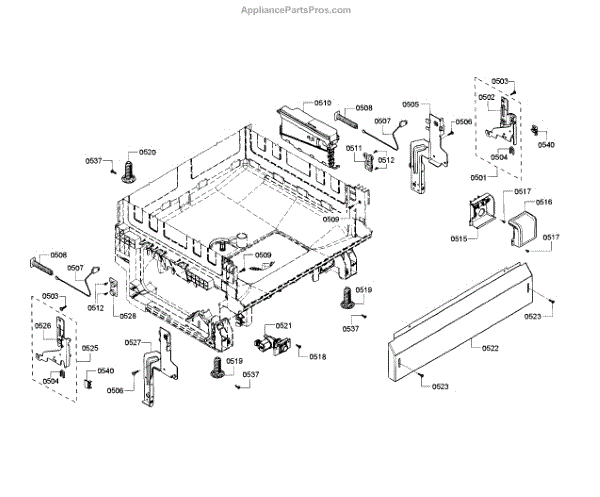 The Base Panel is an OEM part for Bosch dishwashers. It serves as a protective cover for the bottom of the dishwasher, shielding internal components from debris, moisture, and damage while also contributing to the appliance's structural stability.