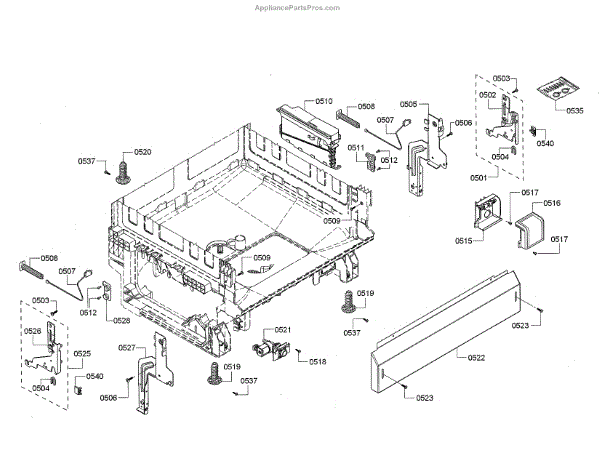 The Base Panel is an OEM part for Bosch dishwashers. It serves as a protective cover for the bottom of the dishwasher, shielding internal components from debris, moisture, and damage while also contributing to the appliance's structural stability.