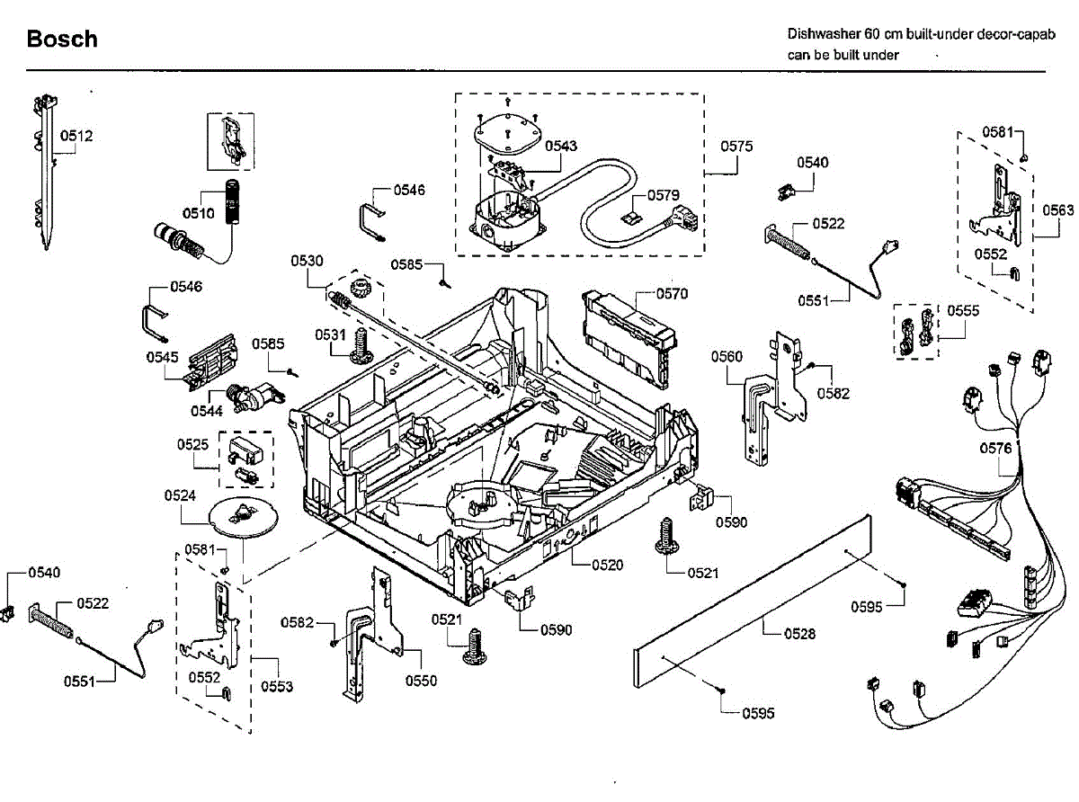 Cable harness for dishwasher base wiring system. Connects pump, controls, and electrical components. Replace if damaged by rodents or frayed wires.
