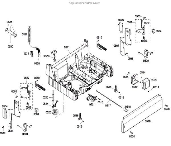The Base Panel is an OEM part for Bosch dishwashers. It serves as a protective cover for the bottom of the dishwasher, shielding internal components from debris, moisture, and damage while also contributing to the appliance's structural stability.