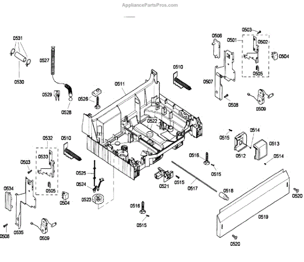 The Base Panel is an OEM part for Bosch dishwashers. It serves as a protective cover for the bottom of the dishwasher, shielding internal components from debris, moisture, and damage while also contributing to the appliance's structural stability.