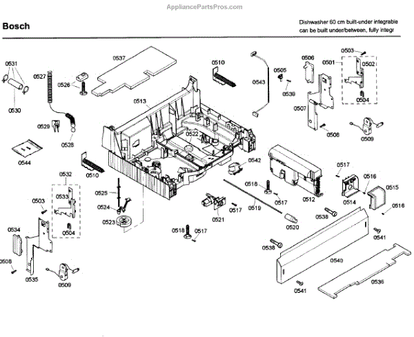 The Base Panel is an OEM part for Bosch dishwashers. It serves as a protective cover for the bottom of the dishwasher, shielding internal components from debris, moisture, and damage while also contributing to the appliance's structural stability.