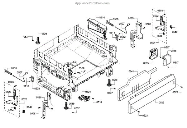 The Base Panel is an OEM part for Bosch dishwashers. It serves as a protective cover for the bottom of the dishwasher, shielding internal components from debris, moisture, and damage while also contributing to the appliance's structural stability.