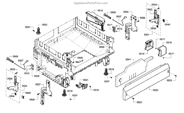 The Base Panel is an OEM part for Bosch dishwashers. It serves as a protective cover for the bottom of the dishwasher, shielding internal components from debris, moisture, and damage while also contributing to the appliance's structural stability.