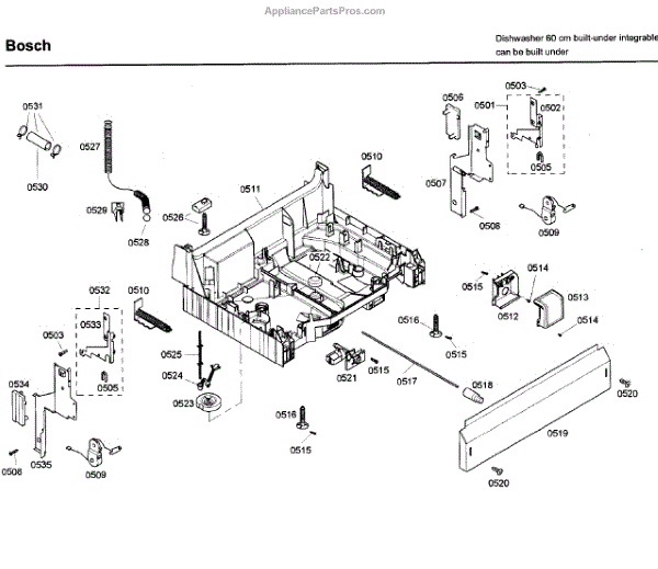 The Base Panel is an OEM part for Bosch dishwashers. It serves as a protective cover for the bottom of the dishwasher, shielding internal components from debris, moisture, and damage while also contributing to the appliance's structural stability.