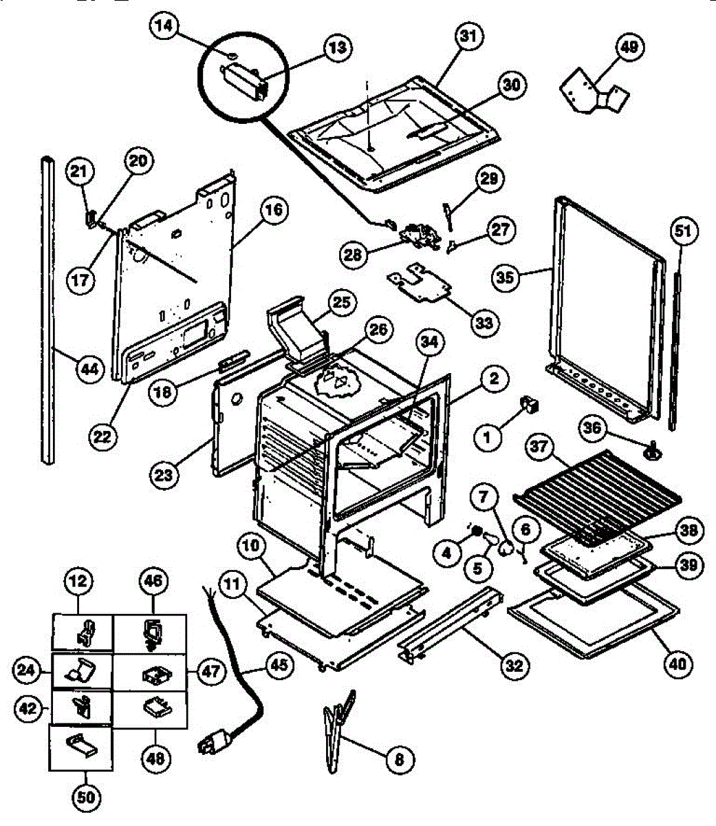 Secures range wiring to the cabinet to prevent loose or pinched wires. Replace if clips are broken or wires hang loose. Verify fit by model number.