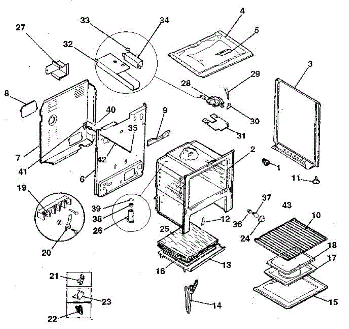 Insulation blanket surrounds the oven cavity to retain heat. Replace if burnt, deteriorated, or damaged by pests to restore proper heat retention.