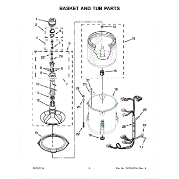 Outer tub assembly holds wash water and houses the inner basket in top-load washers. Replace if cracked, leaking, or damaged during repairs.