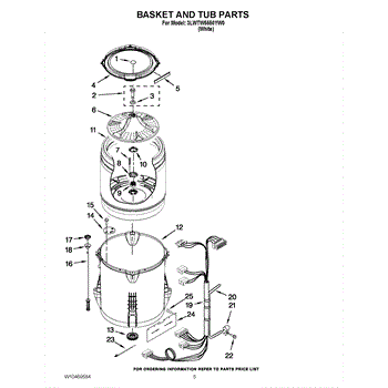 Replacement washer basket that holds clothes during wash cycles. Order a new basket if yours is cracked, damaged, or worn, affecting load capacity.
