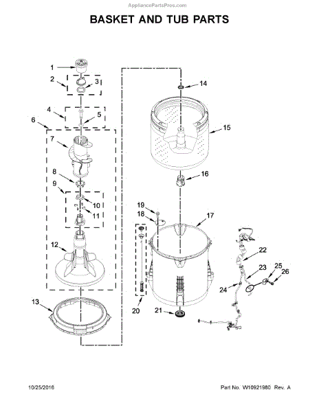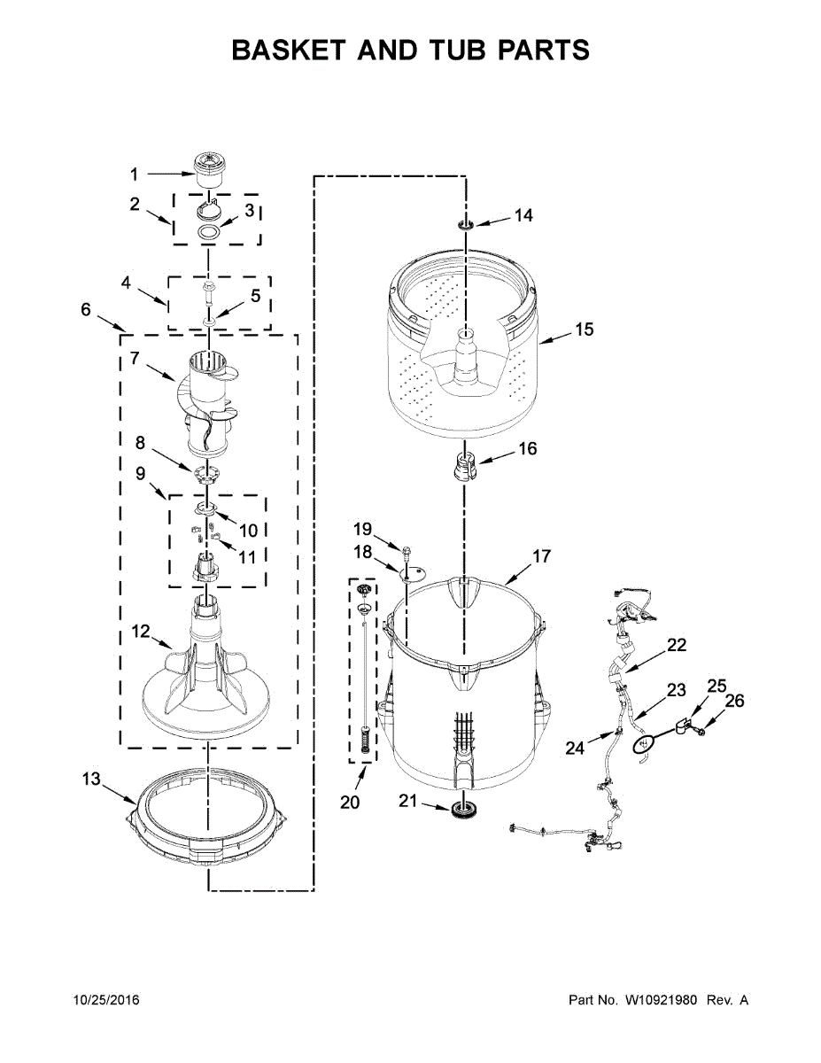 Outer tub assembly holds wash water and houses the inner basket in top-load washers. Replace if cracked, leaking, or damaged during repairs.