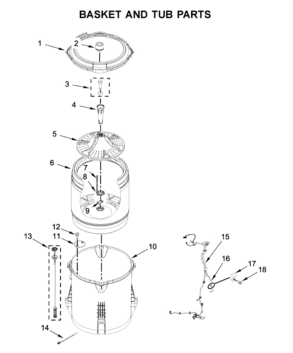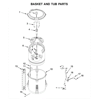 Washer basket assembly that holds clothes during wash and spin cycles. Replace if cracked, damaged, or worn. Direct fit replacement part.