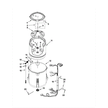 Outer tub assembly for top-load washers. Replace if cracked, broken, or damaged from impact. Houses the inner basket and connects to gearcase assembly.