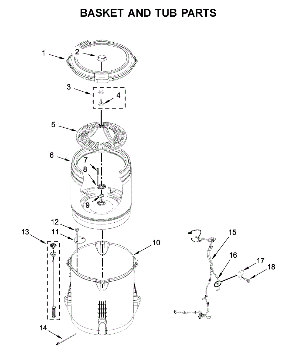 Washer basket assembly that holds clothes during wash and spin cycles. Replace if cracked, damaged, or worn. Direct fit replacement part.