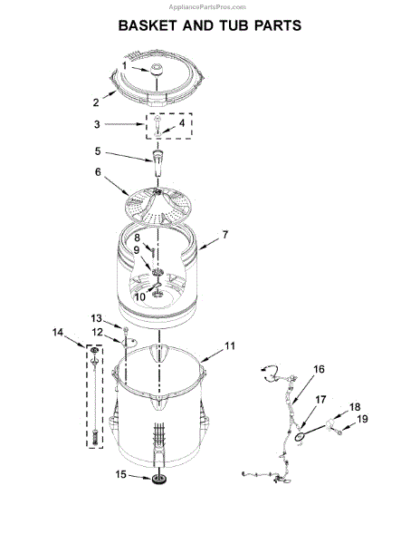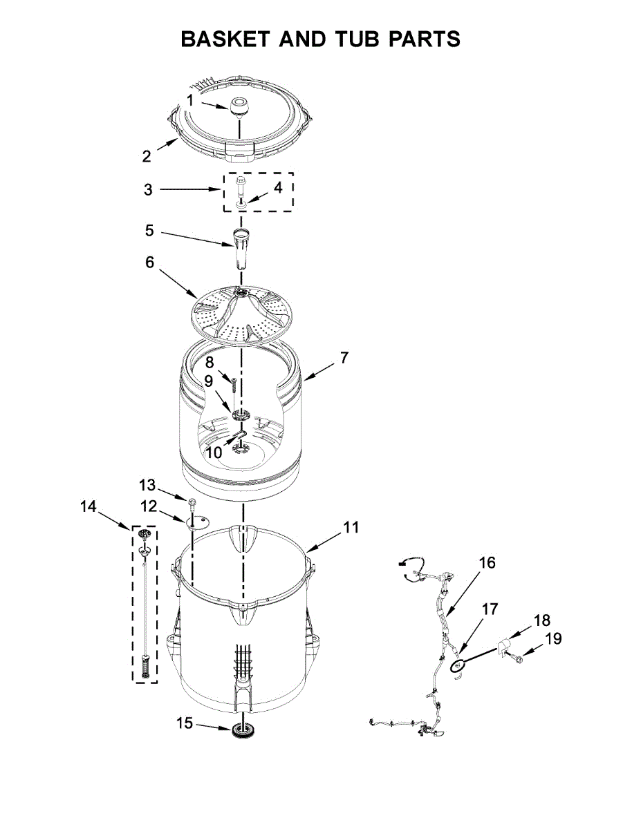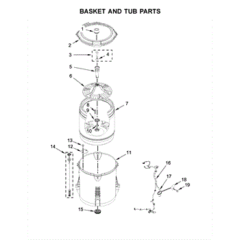 Inner basket assembly for top-load washers. Houses clothes during wash and spin cycles. Replace if cracked, damaged, or showing wear that affects load balance.
