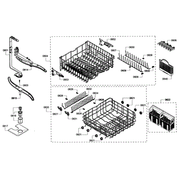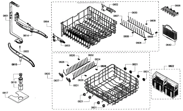 The Insert is an OEM component for Bosch dishwashers. It is an track piece designed to securely hold tall items in the lower rack. Made of plastic reinforced with ribs, the insert provides additional organizational support to accommodate larger kitchenware below without tipping or sliding. Causes of a bad insert can include cracks developing from repeated loading/unloading of rack contents or chunks missing from impact damage over time. Symptoms of a bad insert include: