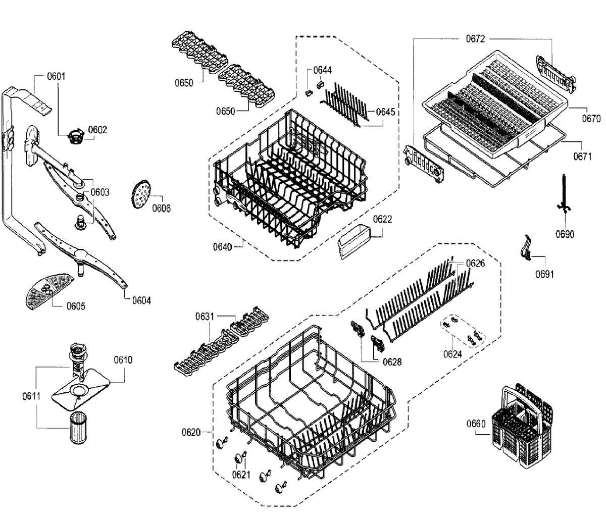 Cutlery basket frame for Bosch dishwashers. Organizes and supports forks, knives, and spoons. Replace if cracked, broken, or damaged from wear.