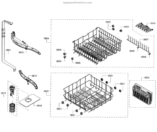 The Upper Dishrack Assembly is an OEM replacement part for Bosch dishwashers. Causes of a bad assembly include cracked or broken rack modules from years of abusive slamming during loading. Mineral buildup may also lead to jammed or stuck tines no longer gliding freely between positions. Symptoms of a bad Upper Dishrack include: