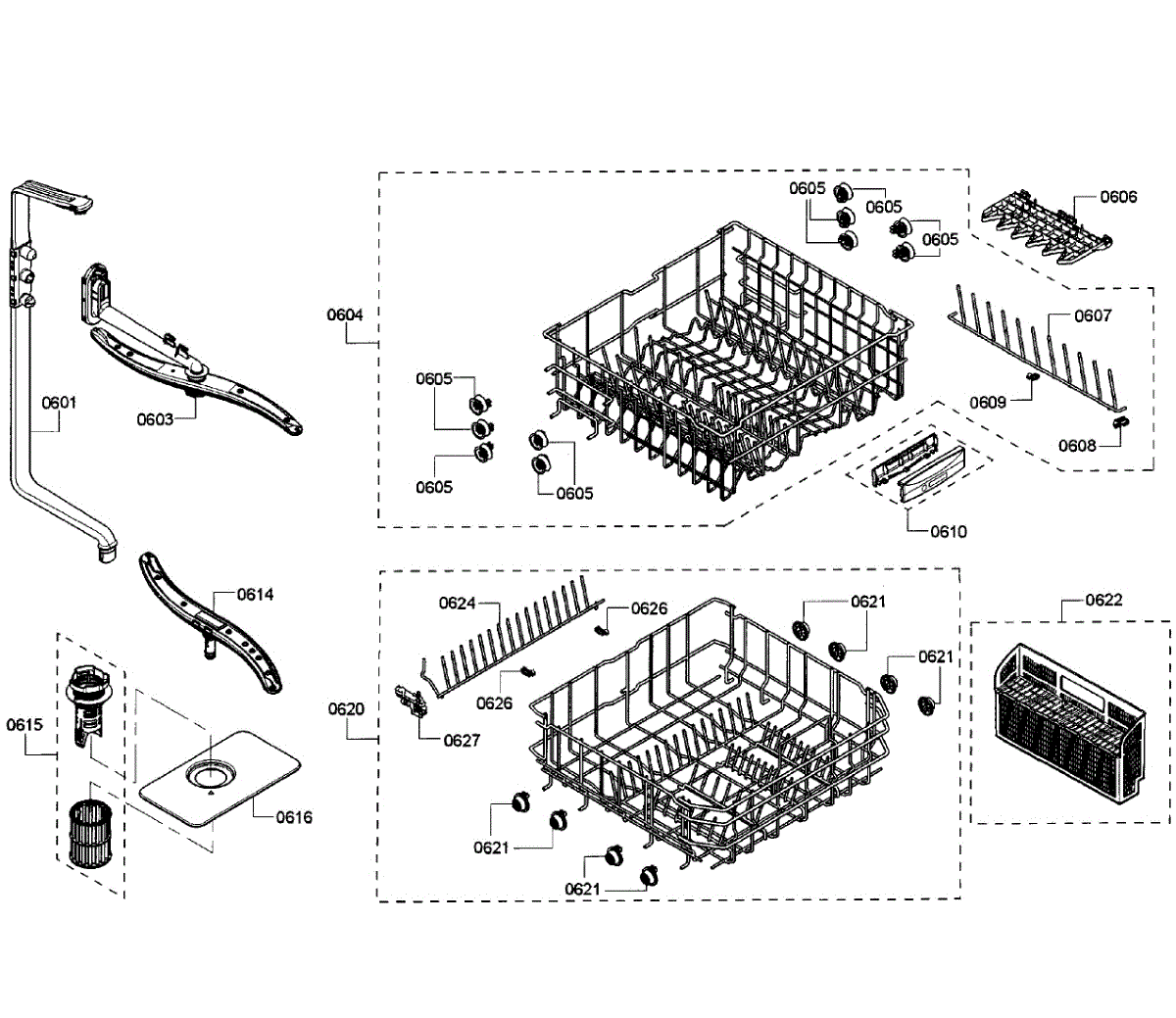 Captures debris before it enters the pump system. Replace when clogged, calcified, or damaged to prevent E22 errors and ensure clean dishes. Verify fit.