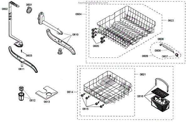 The Silverware Basket Assembly is an OEM part for Bosch dishwashers. This basket is located in the lower rack and is used to hold utensils securely during the wash cycle.