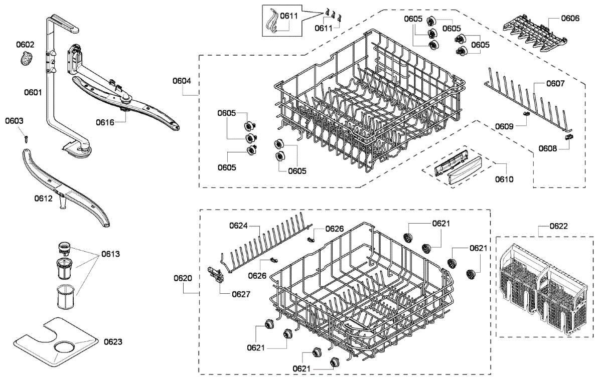 The Insert Dishwasher is an OEM part for Bosch dishwashers. It is a metal basket insert that mounts inside the lower rack of the dishwasher. This insert divides the lower rack into separate sections, allowing for more organization and better placement of dishes, cutlery, and other small items.