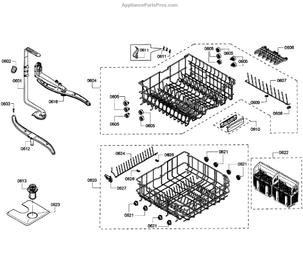 The Upper Dishrack Assembly is an OEM replacement part for Bosch dishwashers. Causes of a bad assembly include cracked or broken rack modules from years of abusive slamming during loading. Mineral buildup may also lead to jammed or stuck tines no longer gliding freely between positions. Symptoms of a bad Upper Dishrack include: