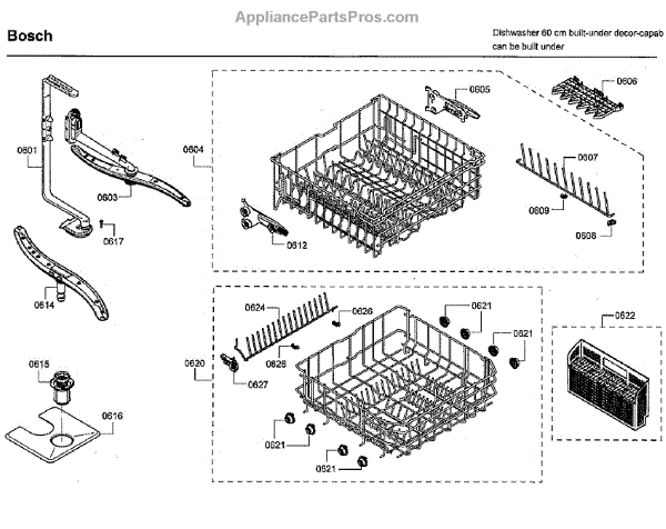 The Upper Dishrack Assembly is an OEM replacement part for Bosch dishwashers. Causes of a bad assembly include cracked or broken rack modules from years of abusive slamming during loading. Mineral buildup may also lead to jammed or stuck tines no longer gliding freely between positions. Symptoms of a bad Upper Dishrack include: