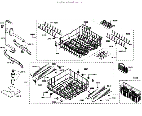 The Upper Dishrack Assembly is an OEM replacement part for Bosch dishwashers. Causes of a bad assembly include cracked or broken rack modules from years of abusive slamming during loading. Mineral buildup may also lead to jammed or stuck tines no longer gliding freely between positions. Symptoms of a bad Upper Dishrack include:
