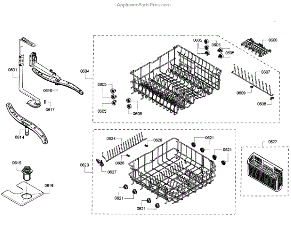 The Upper Dishrack Assembly is an OEM replacement part for Bosch dishwashers. Causes of a bad assembly include cracked or broken rack modules from years of abusive slamming during loading. Mineral buildup may also lead to jammed or stuck tines no longer gliding freely between positions. Symptoms of a bad Upper Dishrack include: