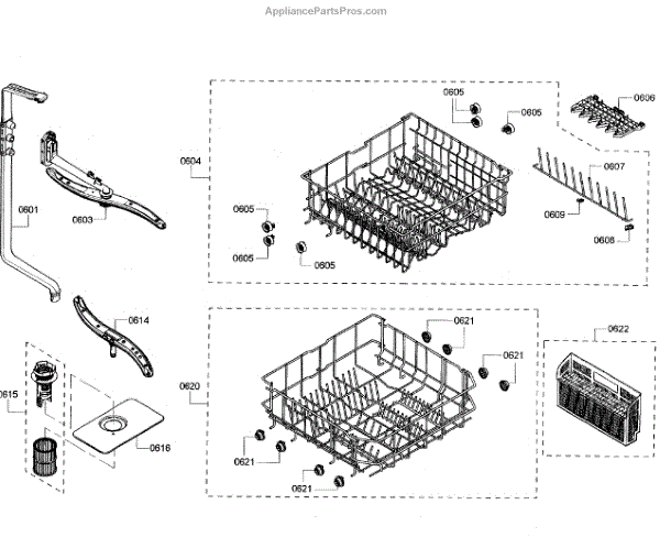The Upper Dishrack Assembly is an OEM replacement part for Bosch dishwashers. Causes of a bad assembly include cracked or broken rack modules from years of abusive slamming during loading. Mineral buildup may also lead to jammed or stuck tines no longer gliding freely between positions. Symptoms of a bad Upper Dishrack include: