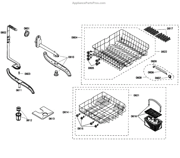 The Silverware Basket Assembly is an OEM part for Bosch dishwashers. This basket is located in the lower rack and is used to hold utensils securely during the wash cycle.