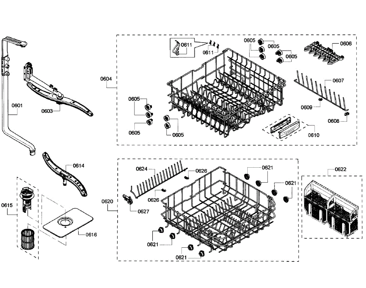 Dishwasher cup rack that holds cups and small items in the upper rack. Replace if your rack is cracked, broken, or missing to restore proper dish organization.