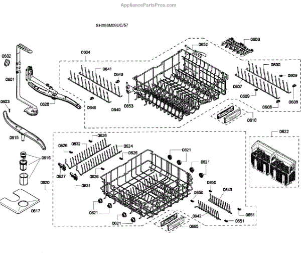 The Upper Dishrack Assembly is an OEM replacement part for Bosch dishwashers. Causes of a bad assembly include cracked or broken rack modules from years of abusive slamming during loading. Mineral buildup may also lead to jammed or stuck tines no longer gliding freely between positions. Symptoms of a bad Upper Dishrack include: