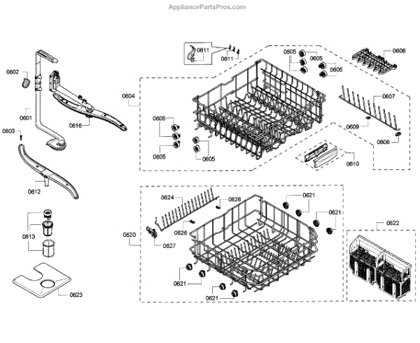 The Upper Dishrack Assembly is an OEM replacement part for Bosch dishwashers. Causes of a bad assembly include cracked or broken rack modules from years of abusive slamming during loading. Mineral buildup may also lead to jammed or stuck tines no longer gliding freely between positions. Symptoms of a bad Upper Dishrack include: