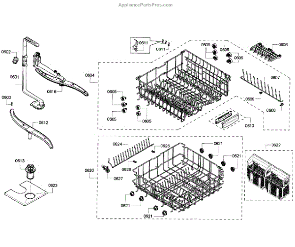 The Upper Dishrack Assembly is an OEM replacement part for Bosch dishwashers. Causes of a bad assembly include cracked or broken rack modules from years of abusive slamming during loading. Mineral buildup may also lead to jammed or stuck tines no longer gliding freely between positions. Symptoms of a bad Upper Dishrack include: