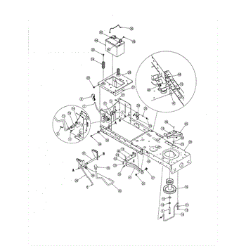 Battery mounting bracket for lawn tractors. Secures the battery in place during operation. Replace if cracked, bent, or corroded to ensure safe placement.