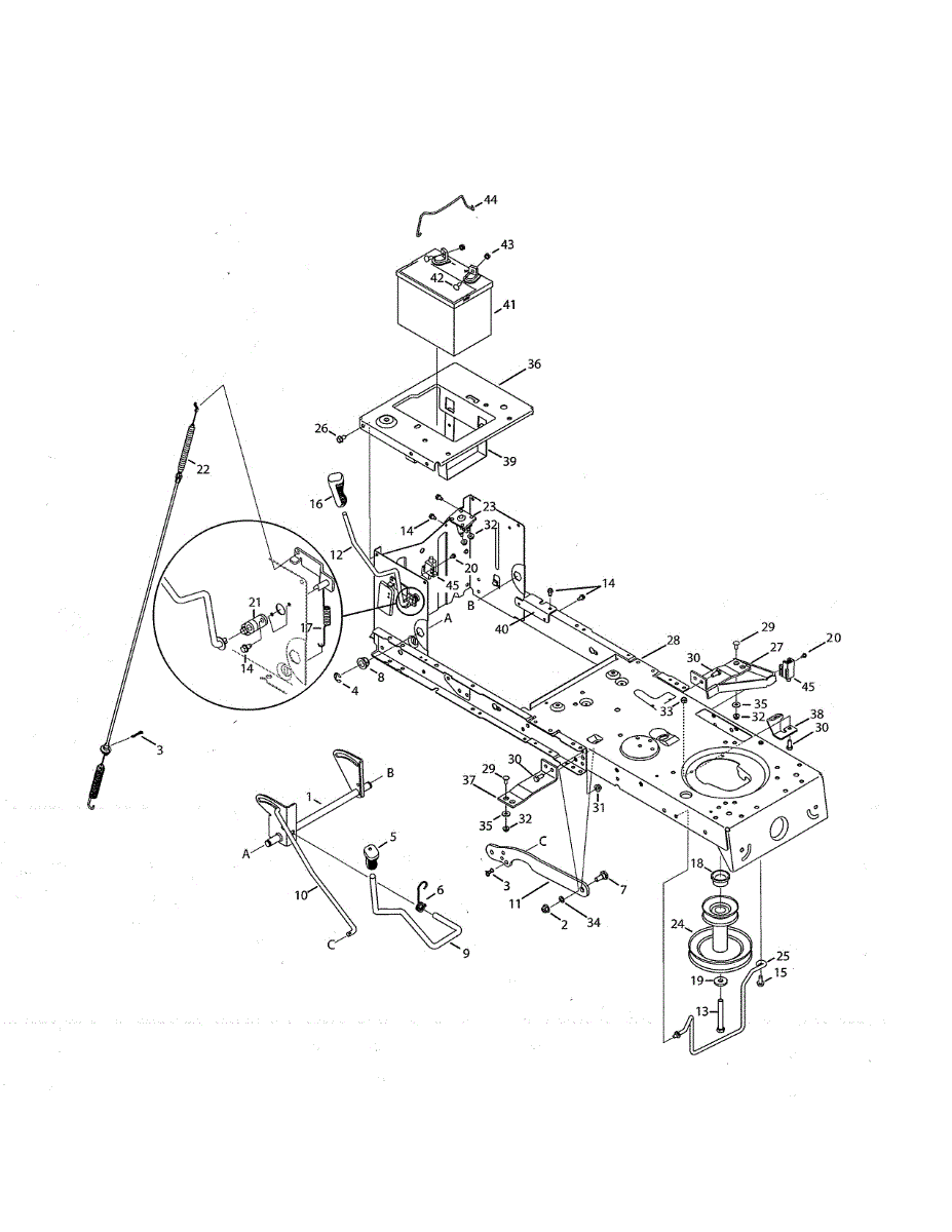 Battery hold down rod assembly for lawn tractors. Secures battery in place. Replace if bent, broken, corroded, or missing to properly mount battery.