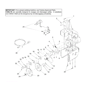 This V-belt is a certified genuine OEM replacement part for a snowblower engine. A V-belt is essentially just a loop of rubber but it is one of the most essential parts of the engine. The V-belt loops around a series of pulleys, and as the drive pulley is turned by the engine, the V-belt transfers that motion and turns the other pulleys. This allows the engine to run more efficiently. While an engine is running, the V-belt is constantly in motion, meaning that it receives a lot of wear. Over time, the rubber material will begin to fray, and if left too long, it will eventually slip or even snap. If the V-belt breaks, the transmission will no longer run and the auger blades will not turn. Therefore, it is important to check the V-belt's condition frequently. As soon as it begins to fray, replace it using a set of socket wrenches. Be sure to follow the owner's manual as a guide for how to loop the new belt. This replacement V-belt is compatible with MTD, Troy-Bilt, and Craftsman snowblowers and it comes sourced from its original manufacturer. This part ships individually.
