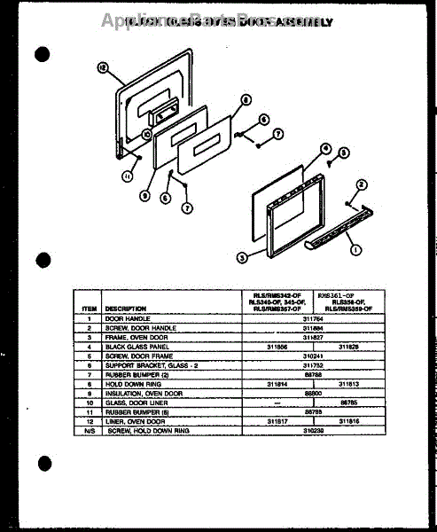 Parts for Caloric RLS313-OF: Black Glass Oven Door Assembly (Rls342-Of) (Rms342-Of) (Rls340-Of) (Rls345-Of) (Rls357-Of) (Rms357-Of) (Rms361-Of) (Rls358-Of) (Rls359-Of) (Rms359-Of) Parts